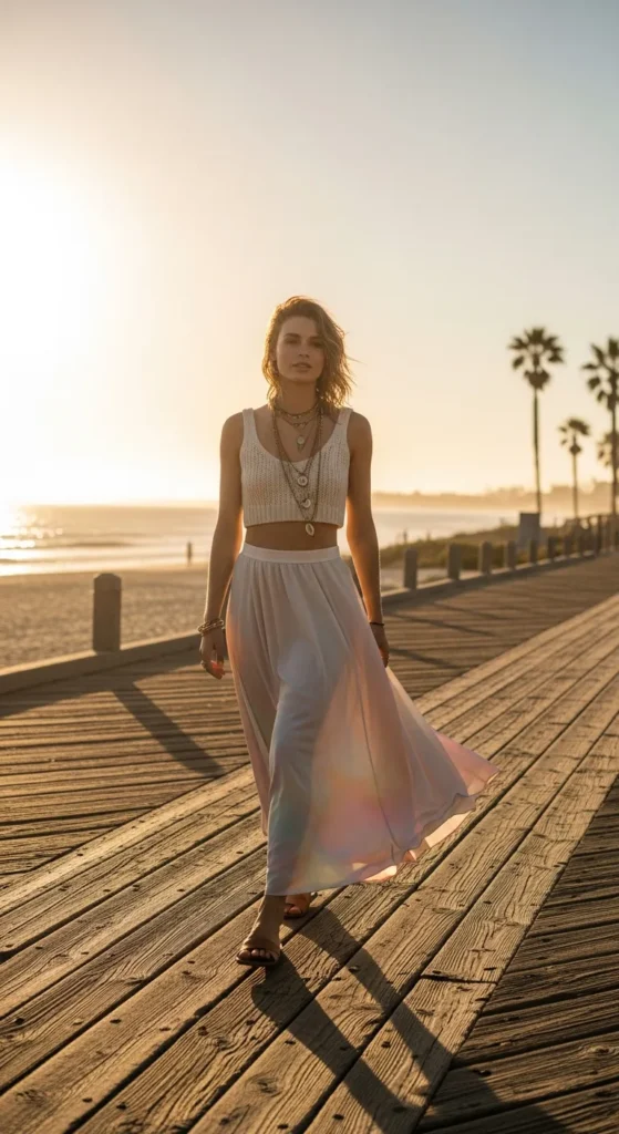 A soft, lightweight knit crop top paired with a flowing maxi skirt creates a harmonious mix of structure and fluidity, perfect for beachside or park outings.
