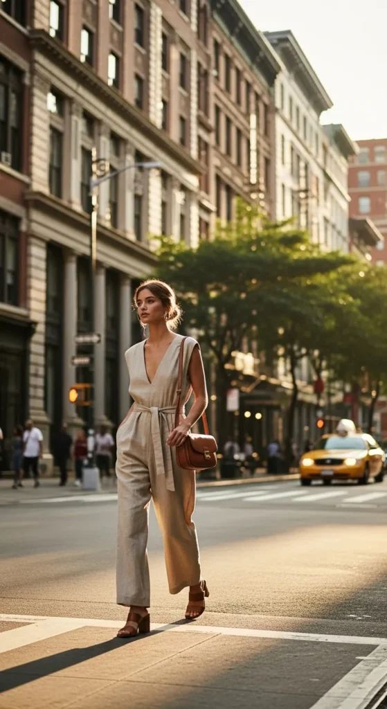 A linen or cotton jumpsuit with a belted waist creates a streamlined silhouette. Its simplicity allows for effortless transitions from daytime errands to evening dinners.