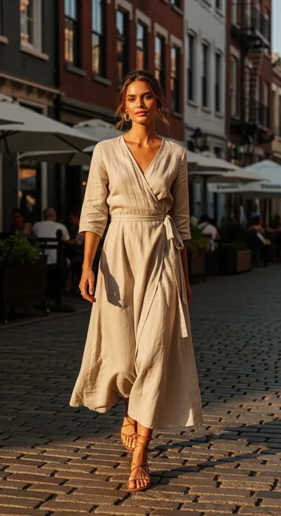 1. Linen Wrap Dress with Strappy Sandals