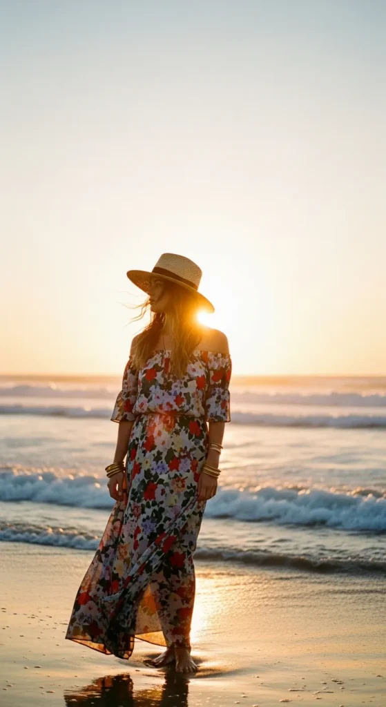 A bohemian-inspired off-shoulder maxi dress in floral prints or earthy tones exudes effortless summer charm, perfect for sunset walks or casual gatherings.
