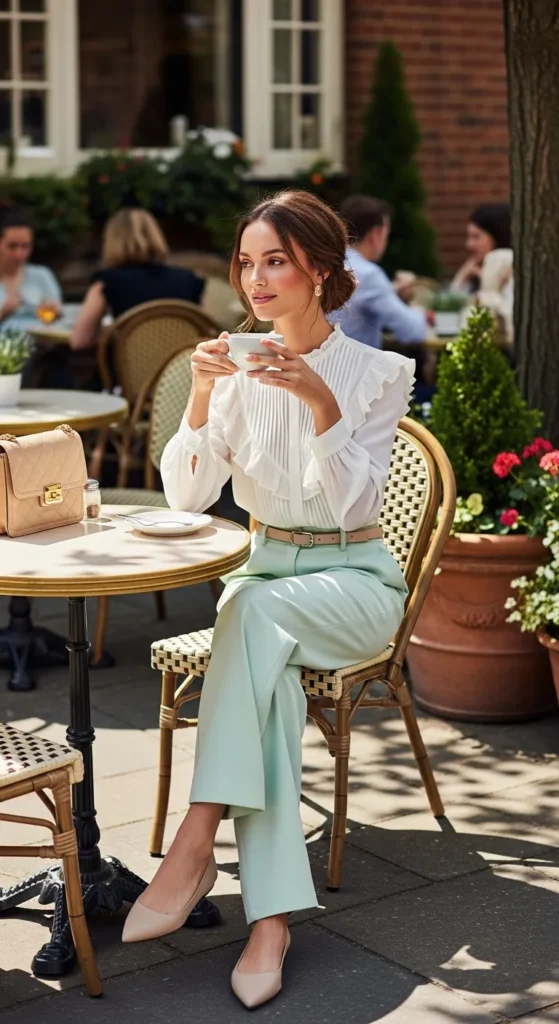 A ruffled blouse tucked into lightweight wide-leg trousers offers a sophisticated yet breezy outfit. The playful ruffles balance the structured flow of the trousers.