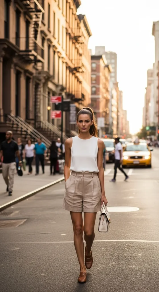 A sleeveless collared shirt tucked into tailored linen shorts delivers a polished yet relaxed summer ensemble. Ideal for casual office days or city explorations.
