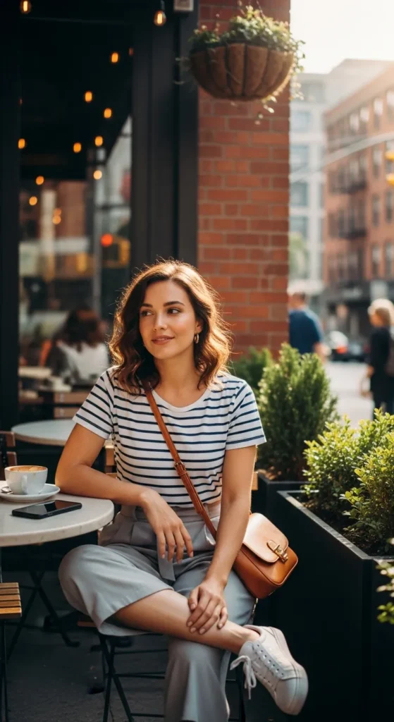 Classic striped tees paired with flowy culottes are effortlessly chic and timeless. This combination balances comfort and style, perfect for casual meet-ups or street-side cafés.