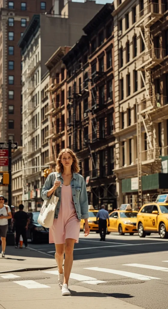 A simple tank dress layered with a light denim jacket offers versatility for fluctuating summer temperatures. Effortlessly stylish for daytime adventures.