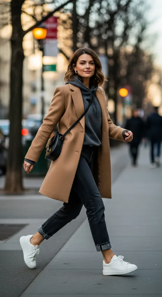 A hoodie can look surprisingly chic when styled intentionally. Paired with smarter pieces, it creates a balanced winter outfit that feels youthful, relaxed, and current.