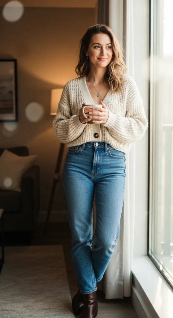 A chunky cardigan brings warmth and comfort, while straight-leg jeans keep things grounded and modern. This outfit feels familiar yet stylish, perfect for days when you want ease without looking underdressed.