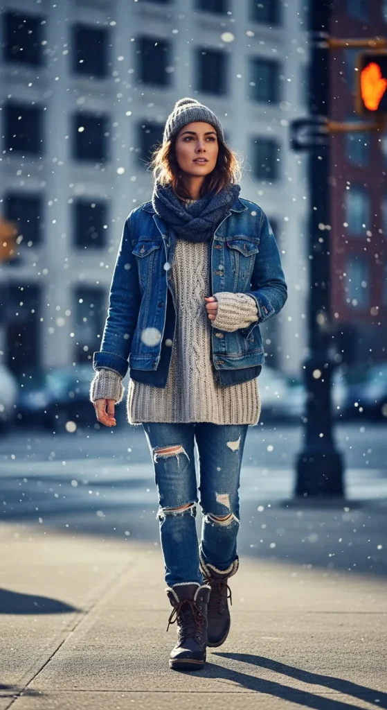 Denim layers feel familiar and confident when styled right. Winter-friendly denim with warm underlayers creates a practical outfit that still feels stylish and intentional.