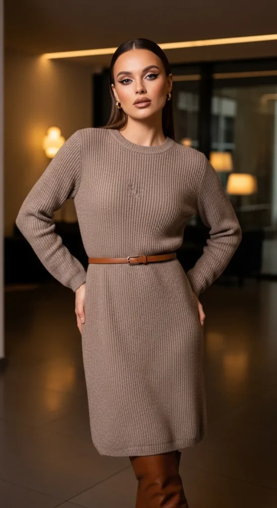 A knit dress is winter’s quiet hero, warm, flattering, and endlessly wearable. Paired with knee-high boots, it creates a sleek silhouette that feels confident without being overly styled.