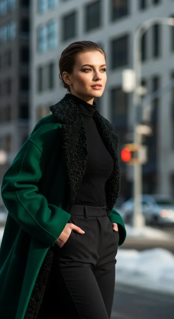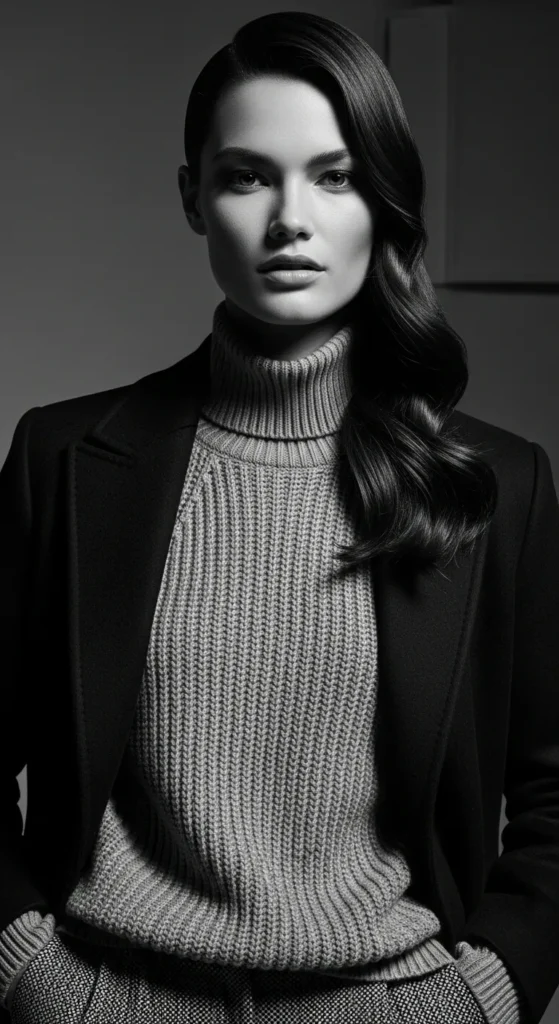 A simple turtleneck becomes powerful when paired with a standout coat. This outfit is minimal at its core but visually strong, perfect for effortless winter elegance.
