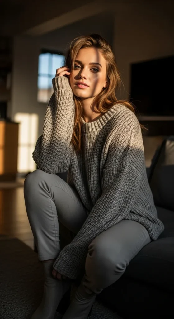 An oversized sweater feels comforting, while sleek bottoms balance the volume. This pairing creates a flattering winter outfit that feels cozy yet confident.