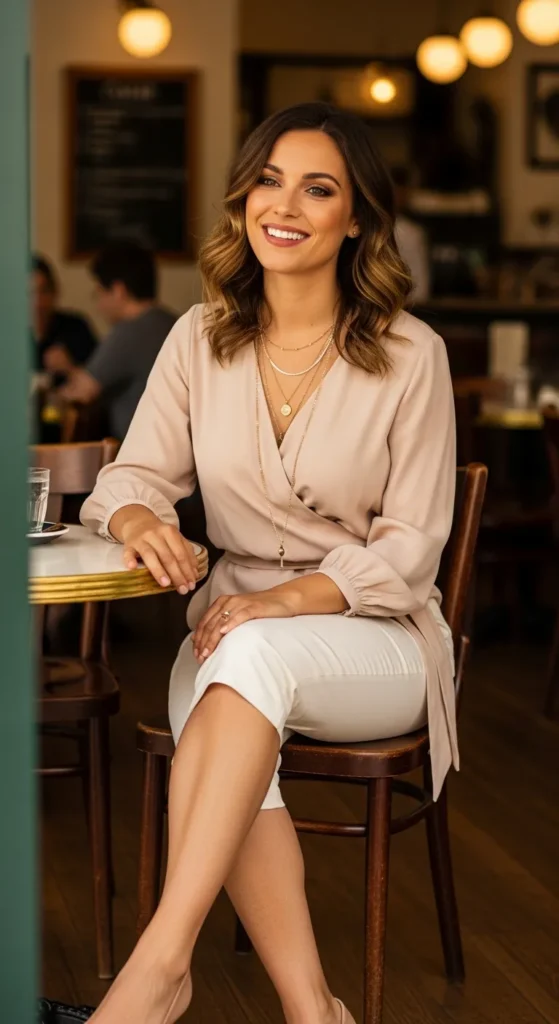 Cream capris paired with a wrap top feel feminine and refined. The gentle drape of the wrap top adds movement, making the outfit look elegant and thoughtfully styled.
