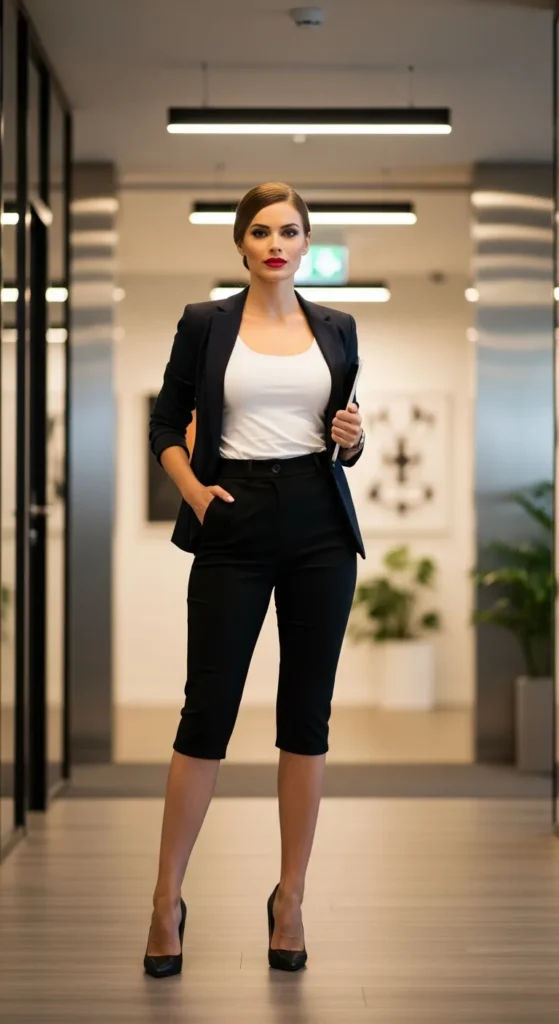 A high-waisted capri styled with a tucked-in tank and a fitted blazer creates a powerful, clean silhouette. It’s modern, flattering, and ideal for a confident, polished look.
