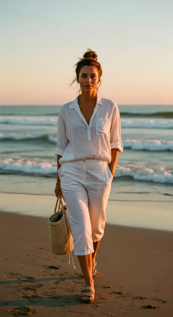 Linen capris styled with a relaxed button shirt offer effortless elegance. The breathable fabric and loose fit create a laid-back yet polished appearance that feels naturally stylish.