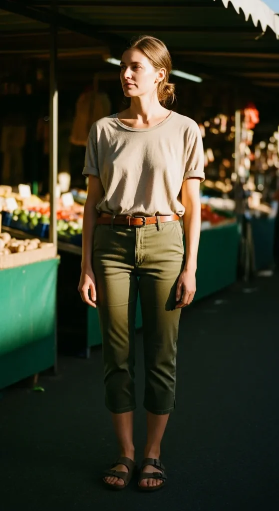 Olive capris styled with a neutral tee and a belt create a grounded, sophisticated casual look. It’s simple yet feels intentional and well-balanced.