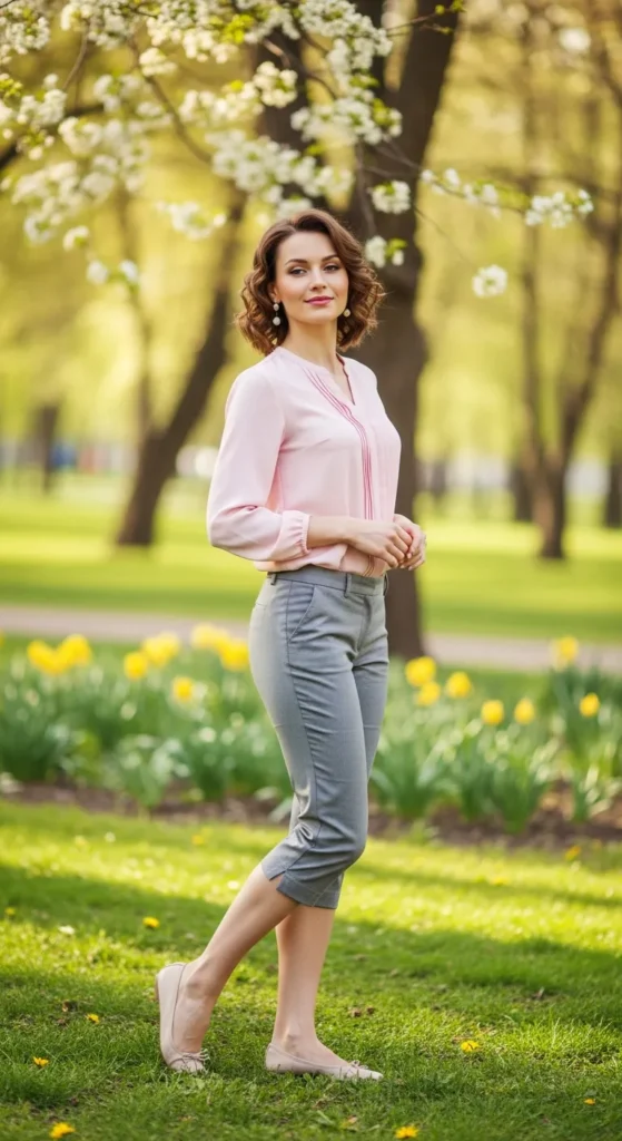 Soft grey capris paired with a pastel blouse create a calm and graceful outfit. The muted tones feel elegant without being loud, perfect for a subtle yet polished presence.