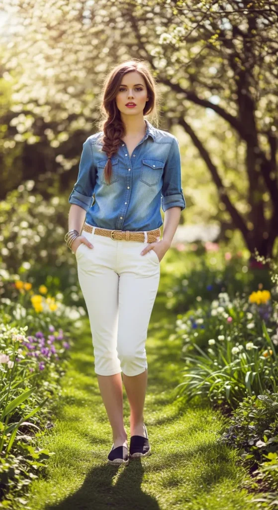 White capris with a chambray shirt create a crisp yet relaxed outfit. The light denim texture adds depth while keeping things effortlessly classy.