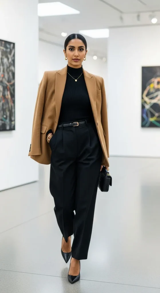 A structured camel blazer over a black turtleneck bodysuit tucked into high-waisted trousers creates clean, uninterrupted lines that look effortlessly chic. The bodysuit eliminates any bunching or untucking concerns, keeping your silhouette smooth throughout the day.
