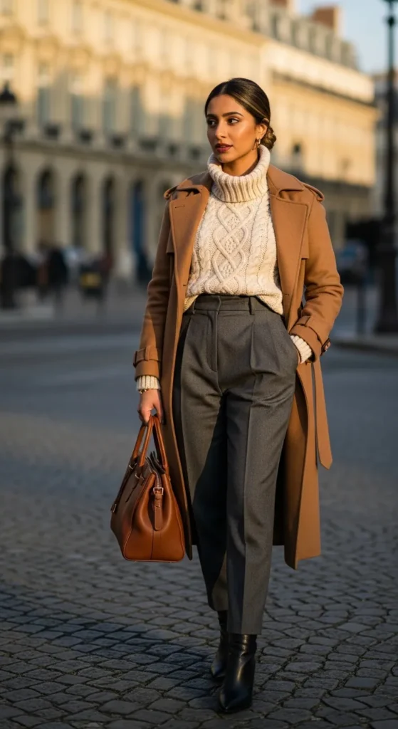 A camel trench coat layered over a chunky cream turtleneck and high-waisted tailored trousers creates that effortless Parisian elegance everyone chases. The monochrome palette feels sophisticated, while the textures add depth and warmth without looking bulky or overdone.