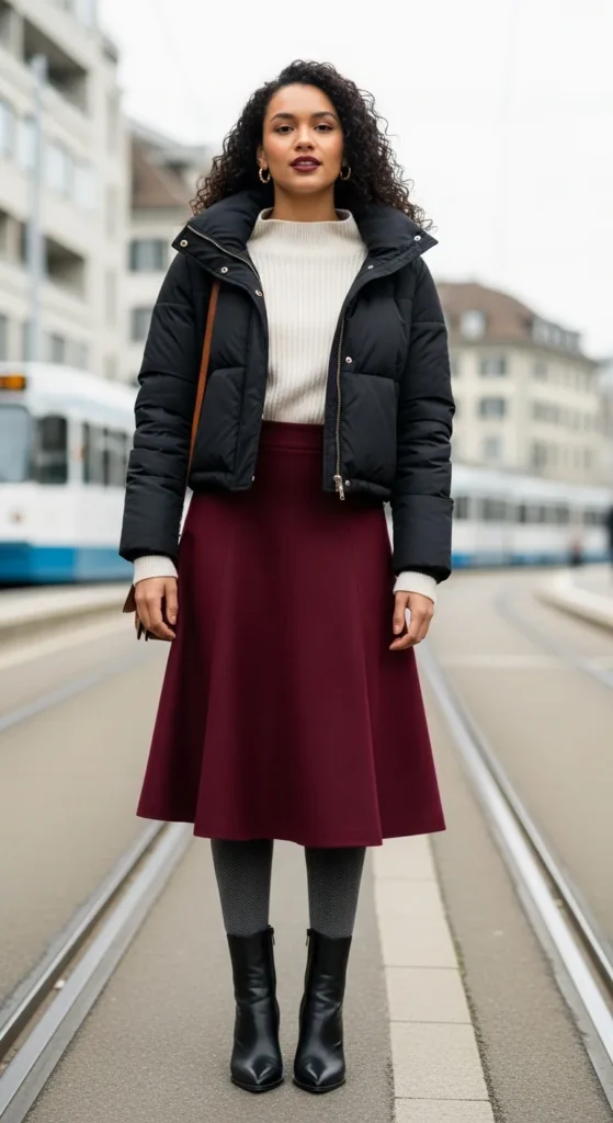 A cropped puffer jacket over a high-neck sweater tucked into a wool midi skirt balances sporty and feminine in an unexpected way. The cropped puffer emphasizes your waist while the midi skirt adds elegance, creating a silhouette that’s both practical and pretty.
