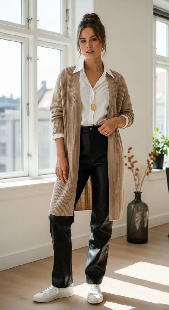 A longline ribbed cardigan draped open over a crisp white button-down tucked into leather pants creates a perfect balance of relaxed and polished. The open cardigan keeps the outfit from feeling too structured while the leather pants add an edge that prevents it from looking frumpy.