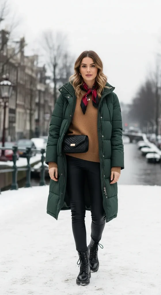 Stylist Suggestion: Add a silk scarf tied loosely around your neck in a jewel tone like emerald or burgundy. The pop of color and luxe fabric elevates the sporty puffer and draws the eye upward, balancing the sleek silhouette of the leggings.