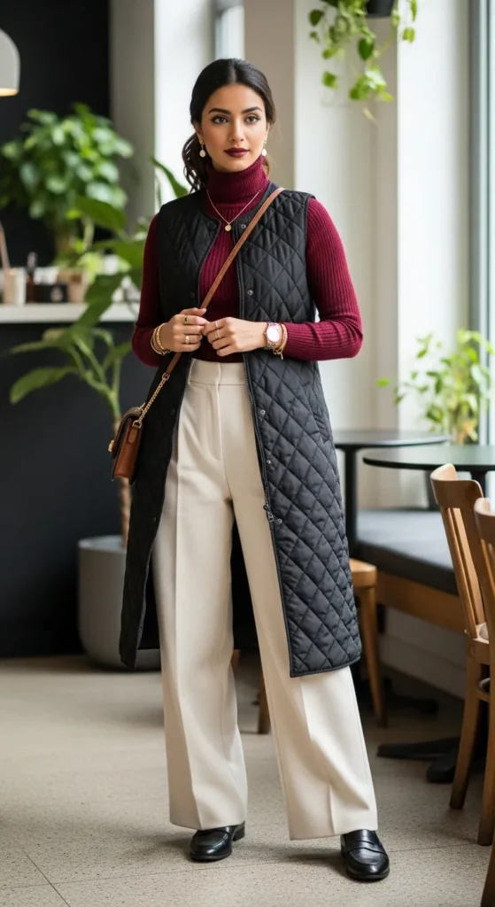 17. Longline Vest Over Turtleneck with Wide-Leg Pants