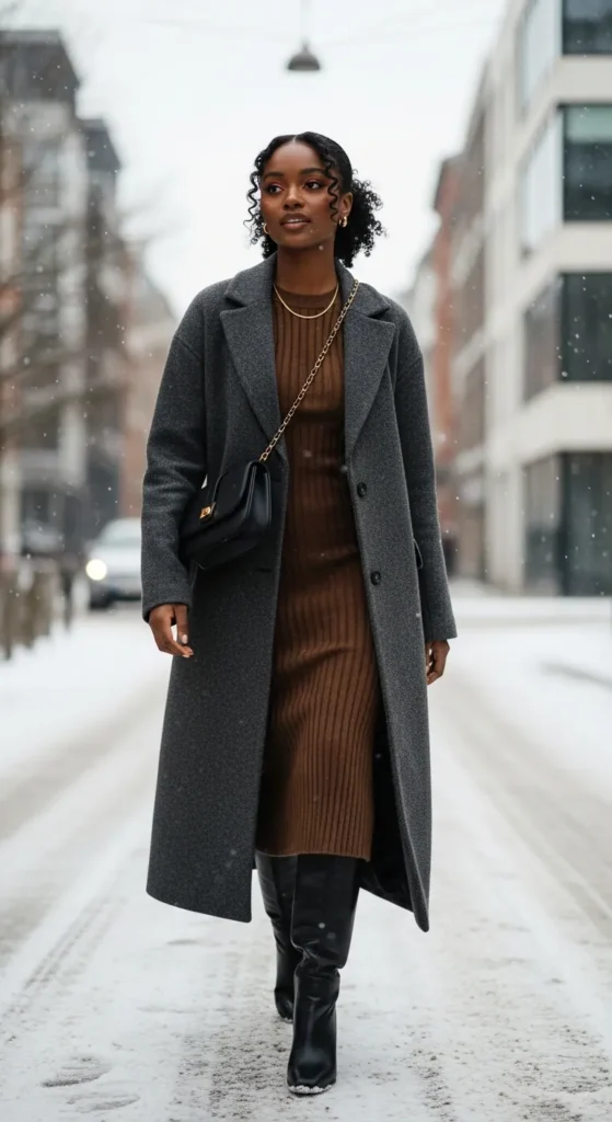 A longline charcoal wool coat paired with a fitted ribbed midi dress and sleek knee-high leather boots strikes that perfect balance between feminine and structured. The elongated silhouette makes you look taller while keeping you completely covered against the cold.