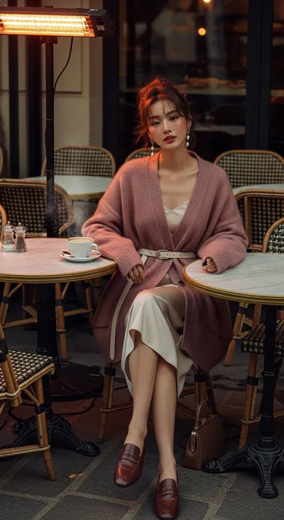 An oversized chunky cardigan belted at the waist over a silky midi slip dress creates an unexpected texture contrast that feels romantic and slightly undone. Paired with polished leather loafers, this outfit bridges cozy and sophisticated in a way that feels uniquely European.