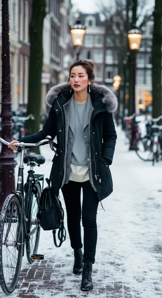 16. Parka with Merino Layers and Slim Black Jeans