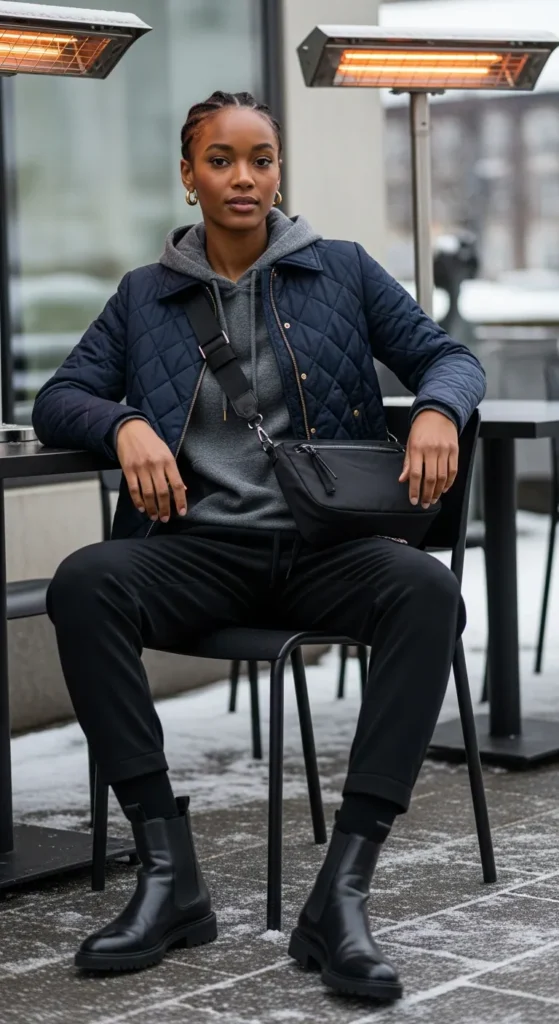 A diamond-quilted jacket over a cashmere hoodie and tailored joggers brings together athleisure and luxury in a way that feels very now. The mix of technical quilting with cashmere softness creates an interesting contrast that’s both comfortable and put-together.