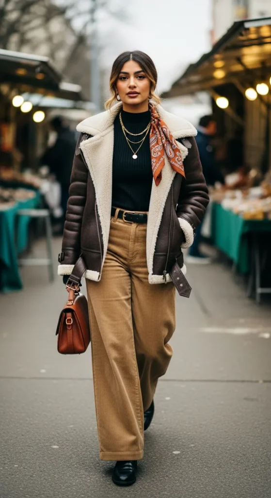 Stylist Suggestion: Add a thin silk scarf in a warm print like paisley or small florals tucked into your jacket. The soft pattern and shine of silk contrasts with the matte textures of shearling and corduroy, adding a feminine touch to the overall earthy palette.