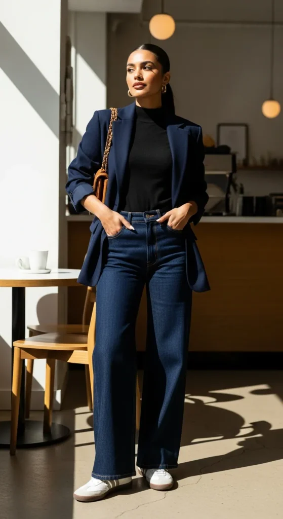 A perfectly tailored blazer in charcoal or navy over a fine merino turtleneck tucked into wide-leg dark wash jeans feels polished but never stuffy. This combination works for everything from coffee dates to casual work settings while keeping you warm and comfortable.