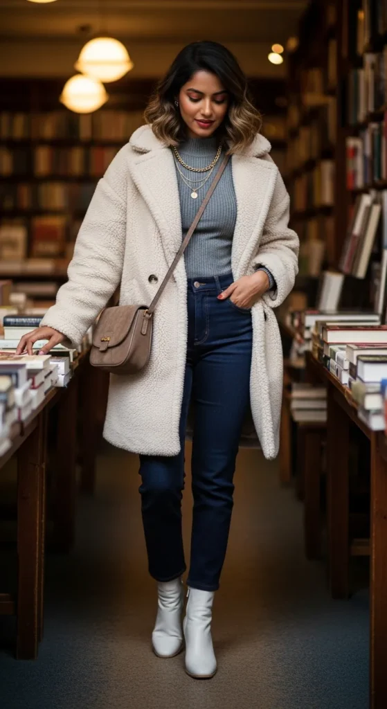 A teddy coat in cream or camel over a fitted thin-gauge knit and dark slim jeans creates a cozy yet streamlined look that’s perfect for daytime exploring. The plush texture of the coat adds visual interest while the slim-fitting pieces underneath keep proportions balanced.