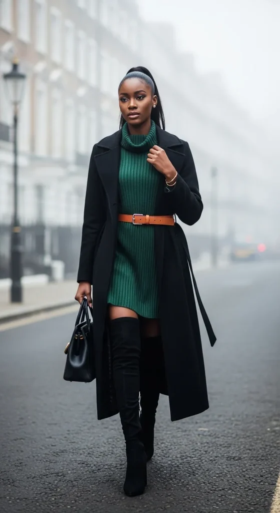 A fitted turtleneck sweater dress in a rich neutral like charcoal or forest green paired with over-the-knee boots and a long wool coat creates dramatic vertical lines that feel sophisticated and intentional. This monochrome approach to winter dressing always looks expensive.