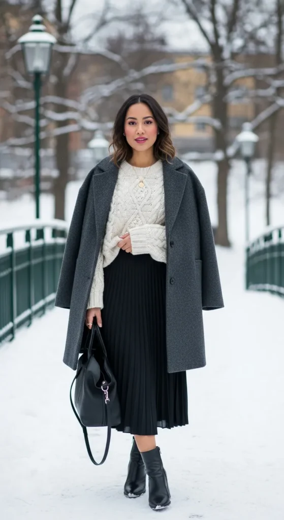 A classic wool coat in charcoal or navy over a chunky knit sweater and pleated midi skirt feels feminine and graceful without being overly dressy. The pleats add movement and visual interest while the chunky knit keeps things grounded and approachable rather than too precious.