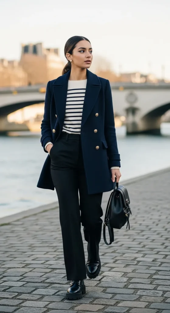 A classic navy peacoat over a long-sleeve Breton striped top and straight-leg black pants channels that timeless French coastal aesthetic that works just as well in the city. The nautical-inspired stripes add visual interest without feeling costume-y or overly themed.