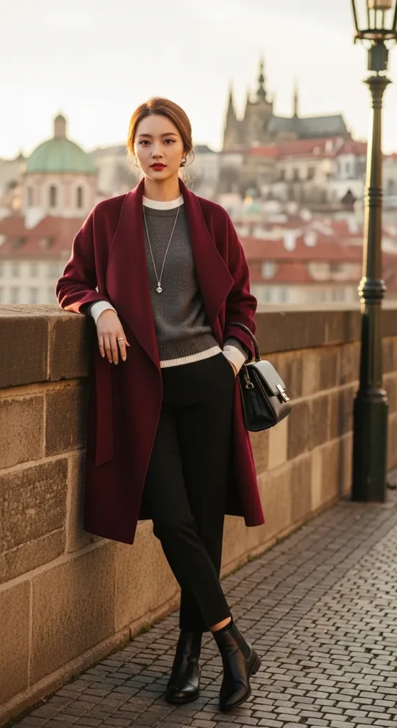 A wrap-style wool coat in a deep wine or navy over layered thin knits creates depth and dimension while maintaining a streamlined silhouette. The wrap detail at the waist is naturally flattering, and layering different knit textures underneath adds interest without bulk.