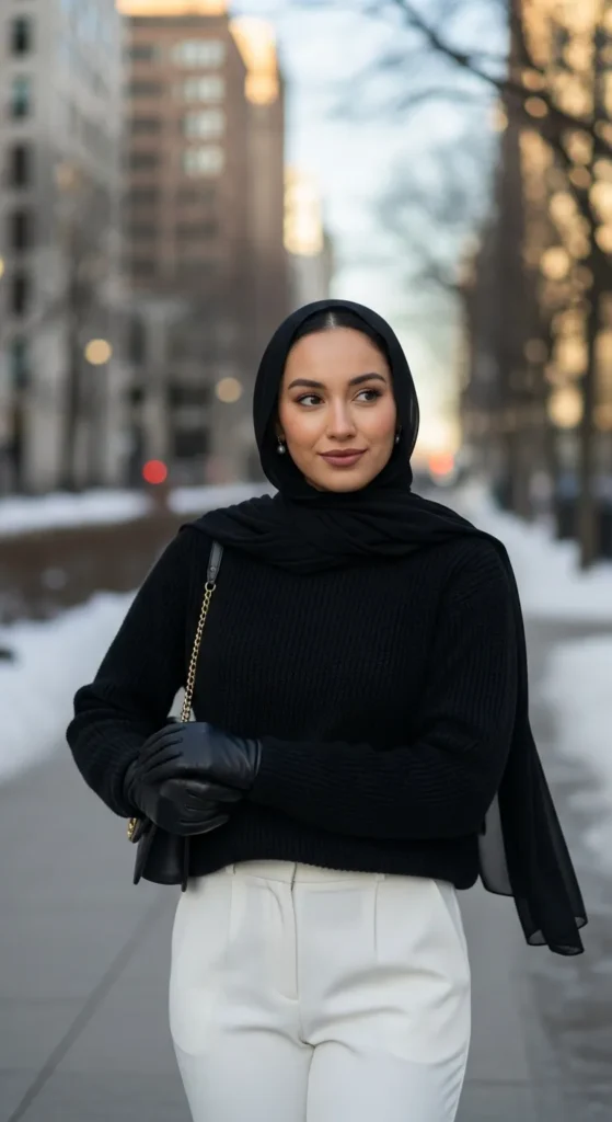 A black sweater and white pants deliver a crisp winter contrast that always looks intentional. The clean palette gives a polished vibe with minimal effort.
