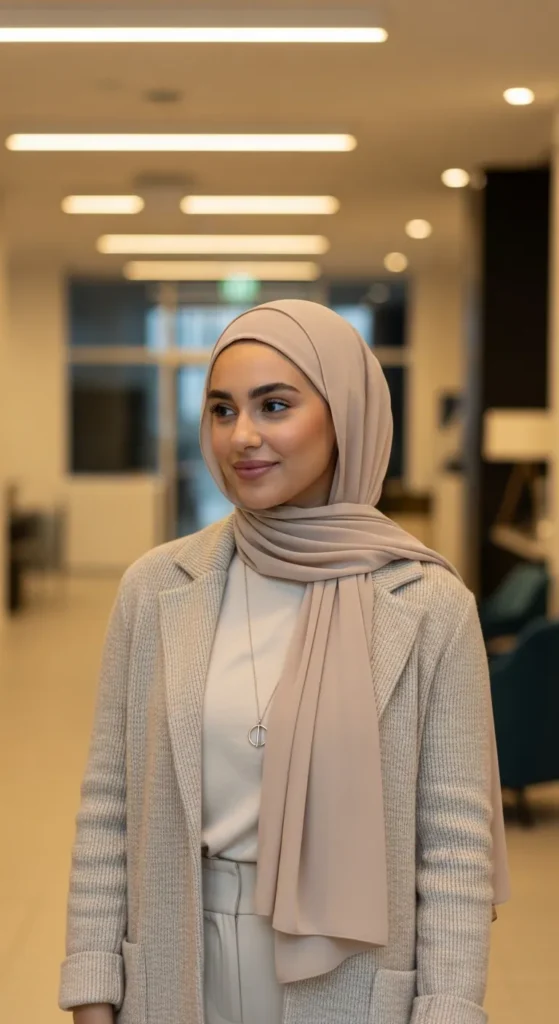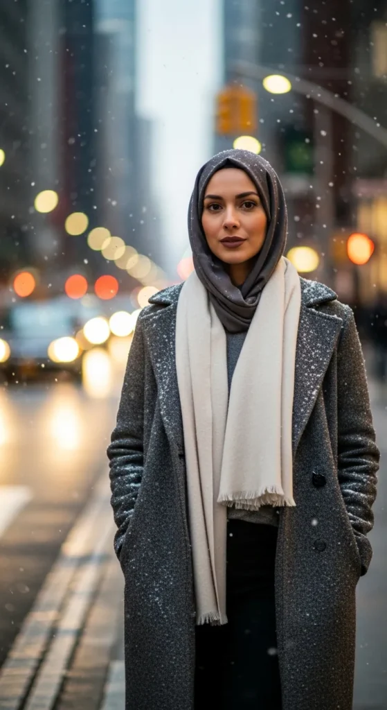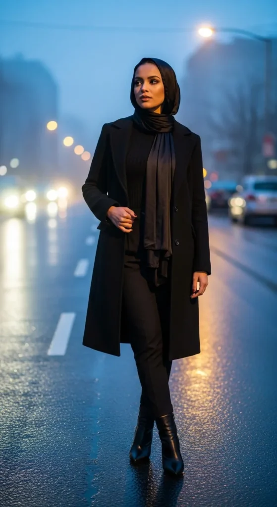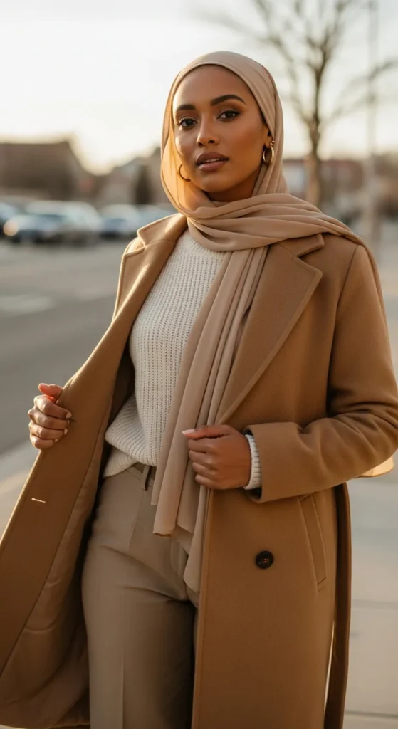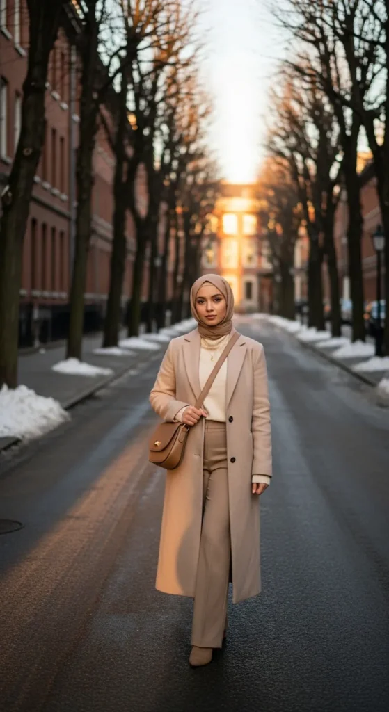 A long coat adds instant sophistication, especially when paired with a matching-toned hijab. The monochrome detail feels intentional and visually elongates the entire frame.