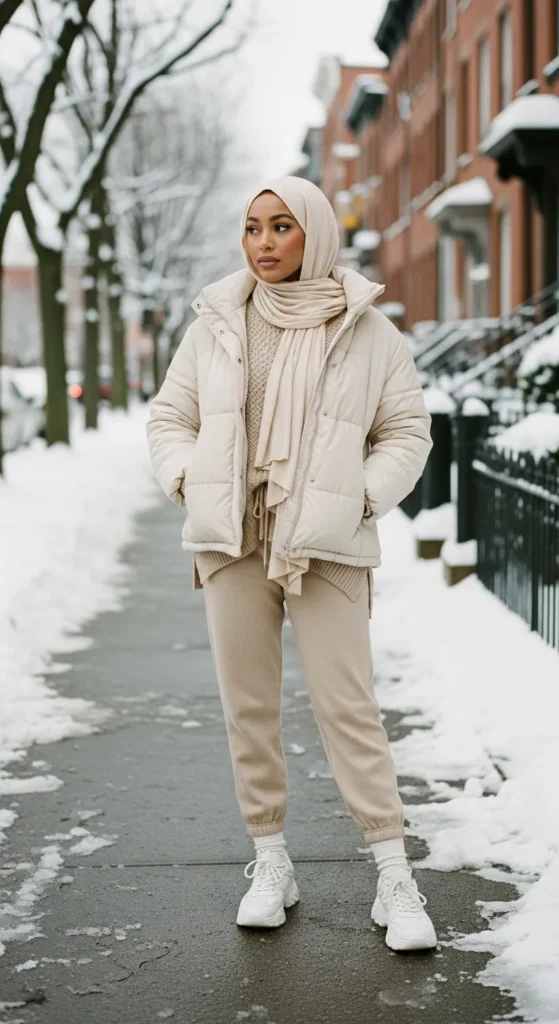A cream puffy jacket paired with soft knits creates a fresh, youthful winter look. It feels warm but still feminine, with a bright, uplifting winter tone.