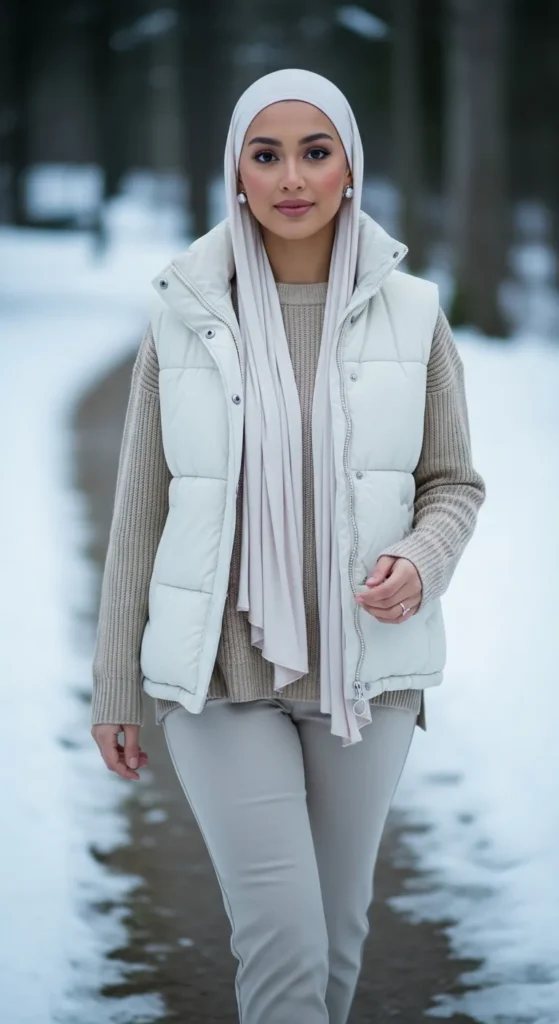 A puffy vest worn over a clean neutral base creates an active, stylish winter mood. It balances comfort and structure, ideal for days when you want to look put-together without committing to heavy layers.
