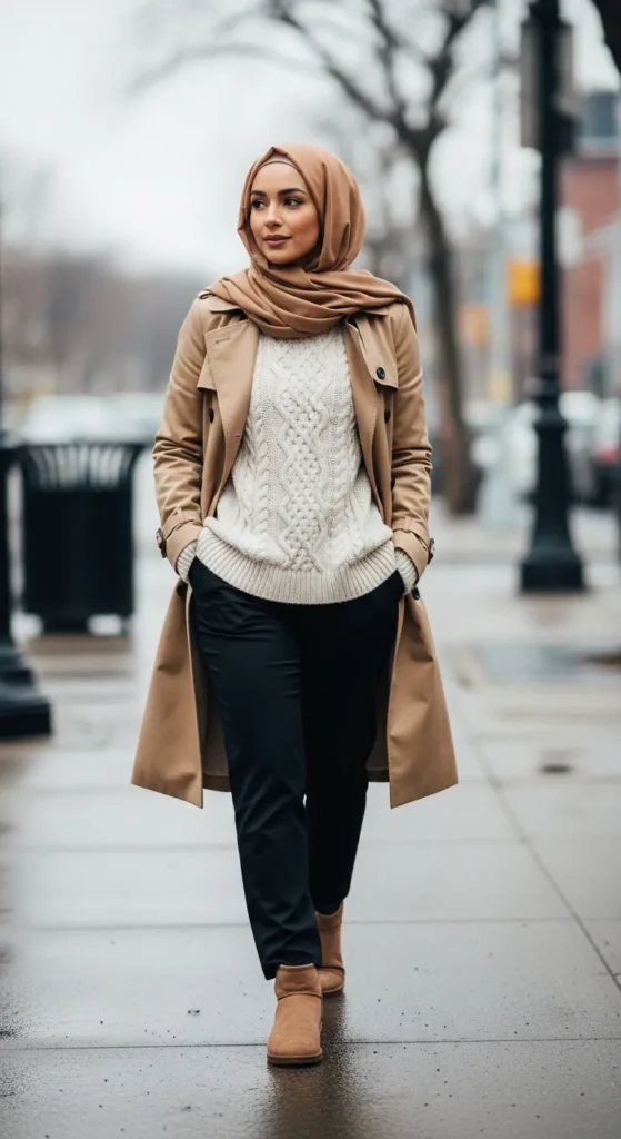 A trench coat in winter feels surprisingly classy when layered right. Paired with a thick sweater, it creates a balanced, graceful silhouette that still feels practical.