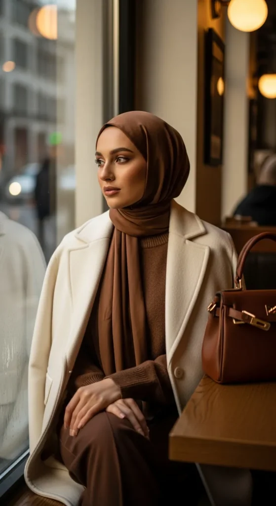 A white wool coat over warm brown layers feels luxurious and winter-perfect. The tones blend beautifully while still offering depth, giving the outfit a classic, slightly elevated feel.