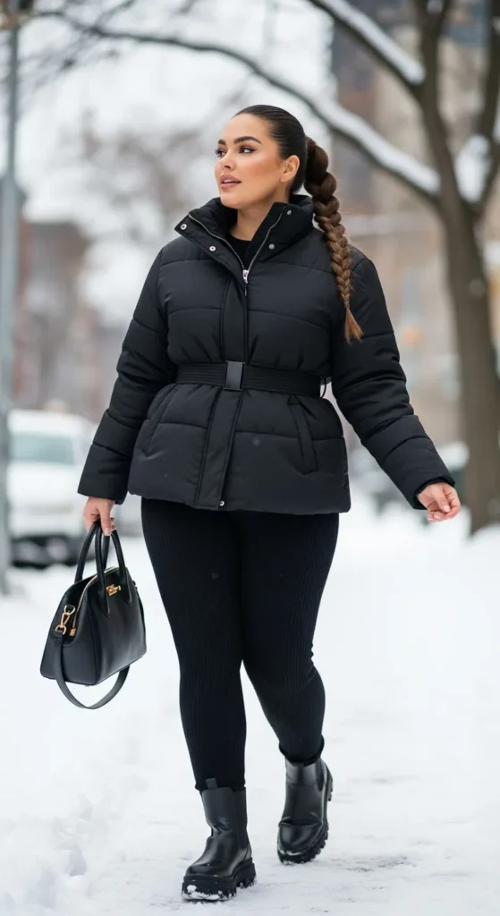 Choose a sleek top-handle bag. Its structure contrasts the puffer’s softness, adding sophistication while emphasizing the defined waistline.