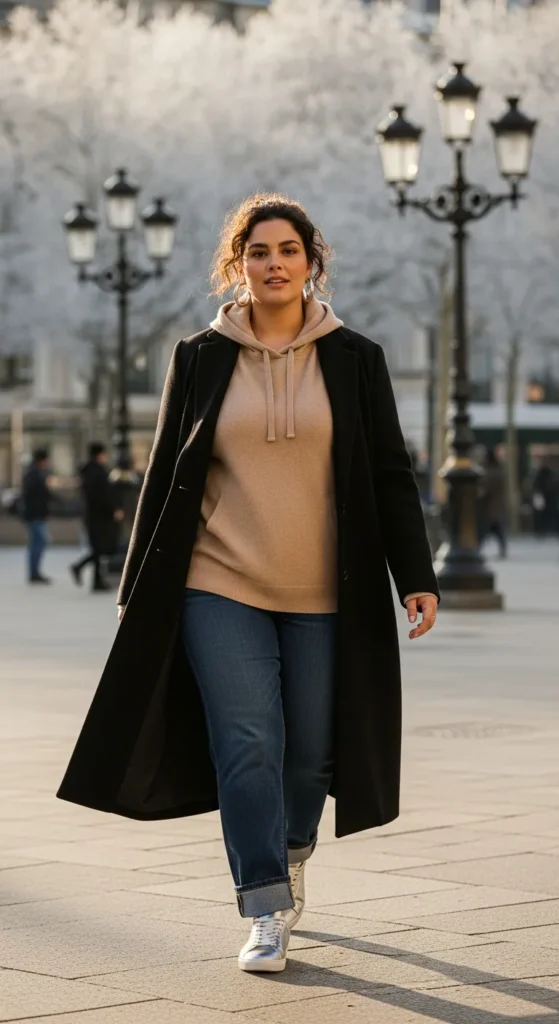 A cashmere hoodie adds luxury to casual comfort, while a tailored coat keeps the look refined. This combination feels modern, cozy, and unbelievably wearable.