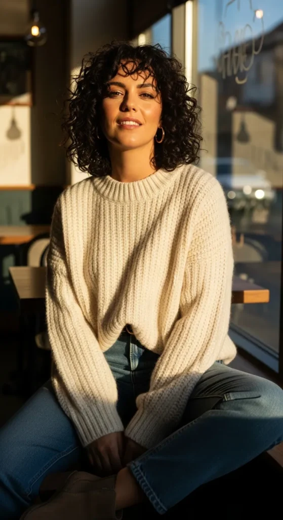 Go for small hoop earrings to maintain balance around the face. Chunky knits already add volume; hoops create a gentle frame without competing with the sweater’s texture.
