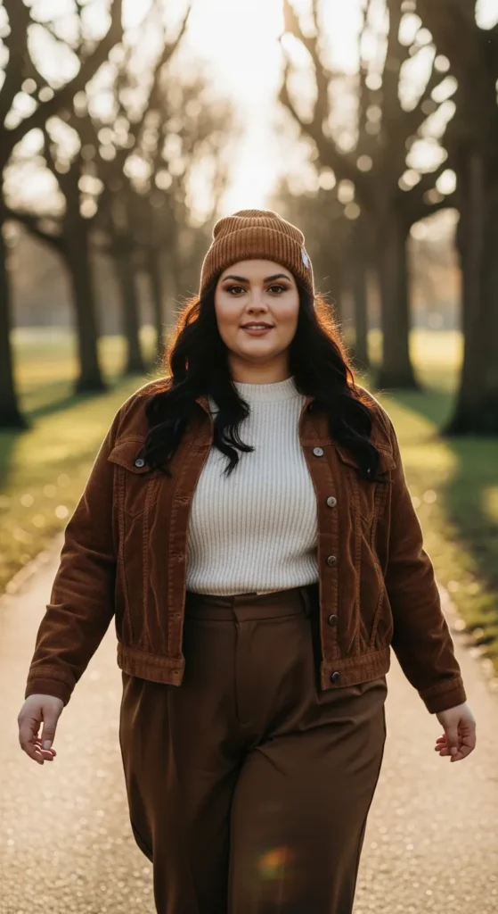 Corduroy brings warm texture that feels nostalgic yet modern. Paired with a fitted knit base and relaxed trousers, it creates a cozy winter outfit that’s stylish without trying too hard.