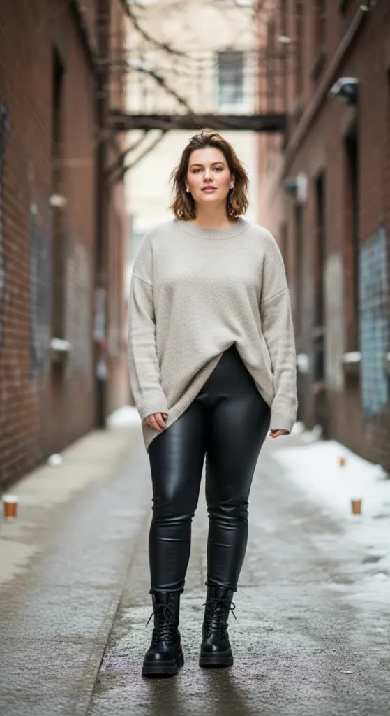 Choose chunky boots to anchor the look. Their weight balances the shine of the leggings and complements the oversized sweater.