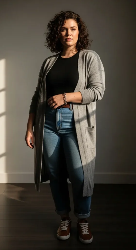 A longline cardigan drapes beautifully, offering warmth without restriction. Paired with minimal basics, it creates a comfortable yet stylish everyday look—easy to wear and easy to love.