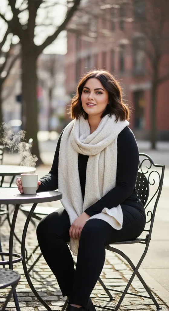 A statement scarf becomes the spotlight against a minimalist base. It adds warmth, personality, and a cozy elegance without overwhelming the look.